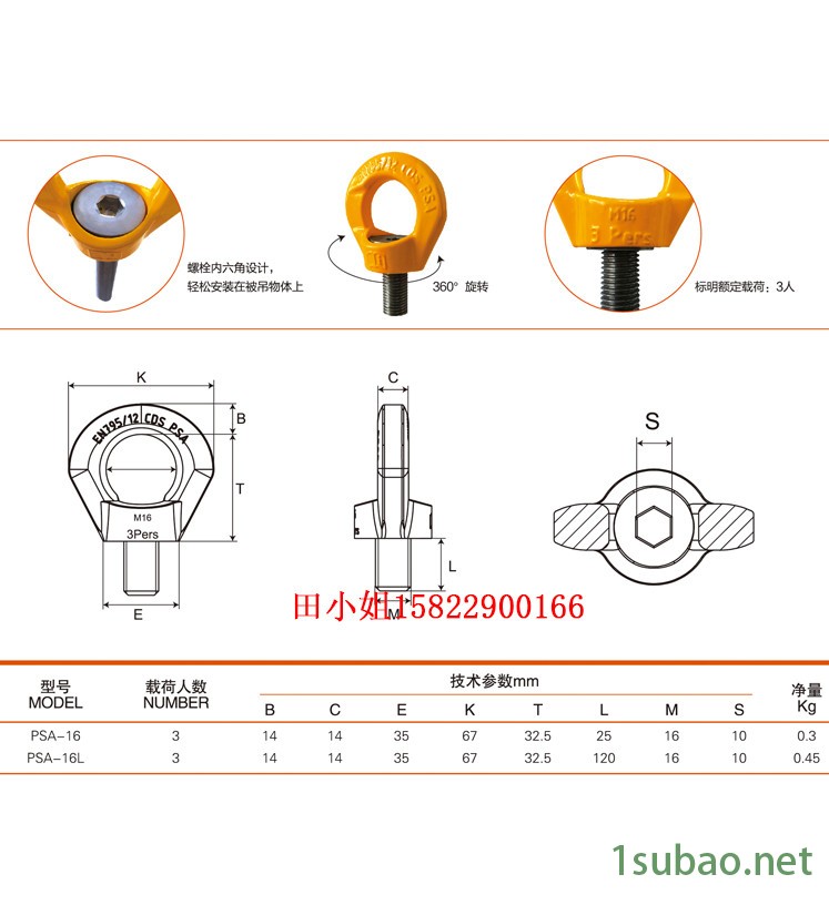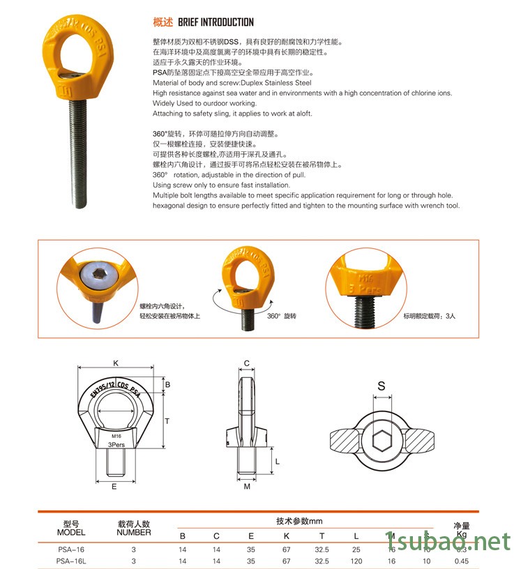 倍力特PSA-M16 安全防坠落锚点现货 DIN EN 795旋转吊环供应 厂家 吊环采购锻造合金钢制作,并均经过淬火回火处理,根据欧洲标准学会EN795标准制造测试。