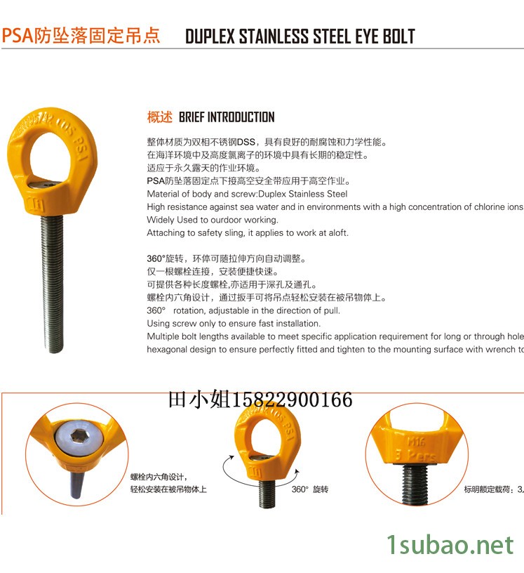 倍力特PSA-M16 安全防坠落锚点现货 DIN EN 795旋转吊环供应 厂家 PSA产品通过德国DGUV认证,产品经过磁粉探伤,锻造件及六角螺栓均可以通过检查报告来质量追溯,满足欧盟规范DIN EN795,DIN EN50308 黄色烤漆吊环